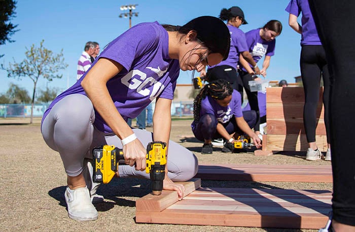 Alexis Tomala watched of dozens of purple-shirted Grand Canyon University student volunteers, literally on hands and knees, drilling holes into hard redwood planks, and couldn’t help but think ahead to when Westwood Elementary students pour into the school’s courtyard and behold the site of growing vegetables.