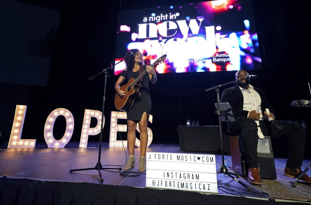 The eighth annual Honors College Banquet transformed GCU Arena for "A Night in New York." More than 350 Honors students of all grade levels mingled, enjoyed a catered dinner, celebrated the award presentations and listened to live music by Honors College Director of Operations Dennis Williams and his wife, Julianne, through their musical group, J Forte Music. (Here’s a slideshow.)