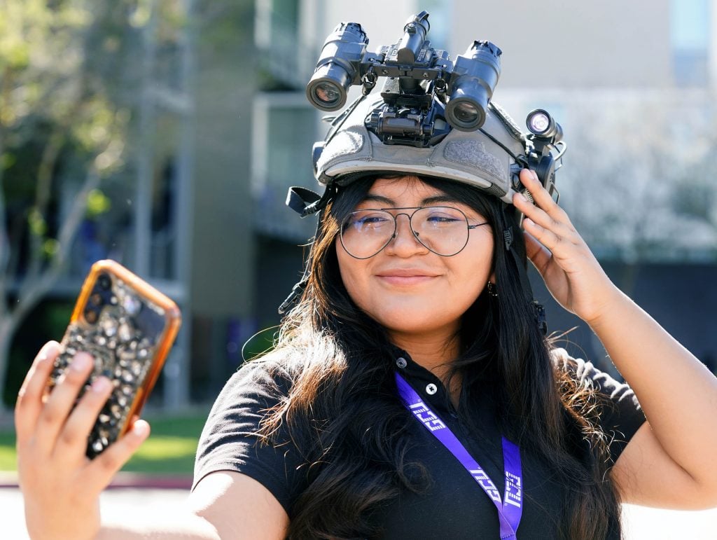 A high school student takes a selfie wearing a Phoenix Police SWAT helmet during the College of Natural Sciences’ annual Forensic Science Day. Feb. 26, 2026. -