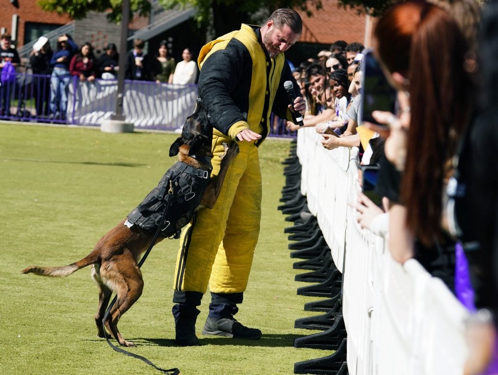 Urosh, a Phoenix Police Department K-9 Unit Belgian Malinois, focuses on his target during a demonstration on the Quad as part of the College of Natural Sciences’ annual Forensic Science Day. Feb. 26, 2026. -