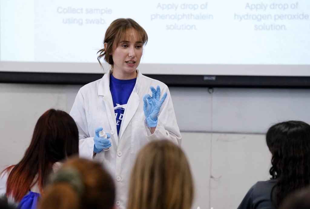 Graduate assistant Kaitlyn West explains the procedure for testing blood during the College of Natural Sciences’ annual Forensic Science Day. Feb. 26, 2026. -