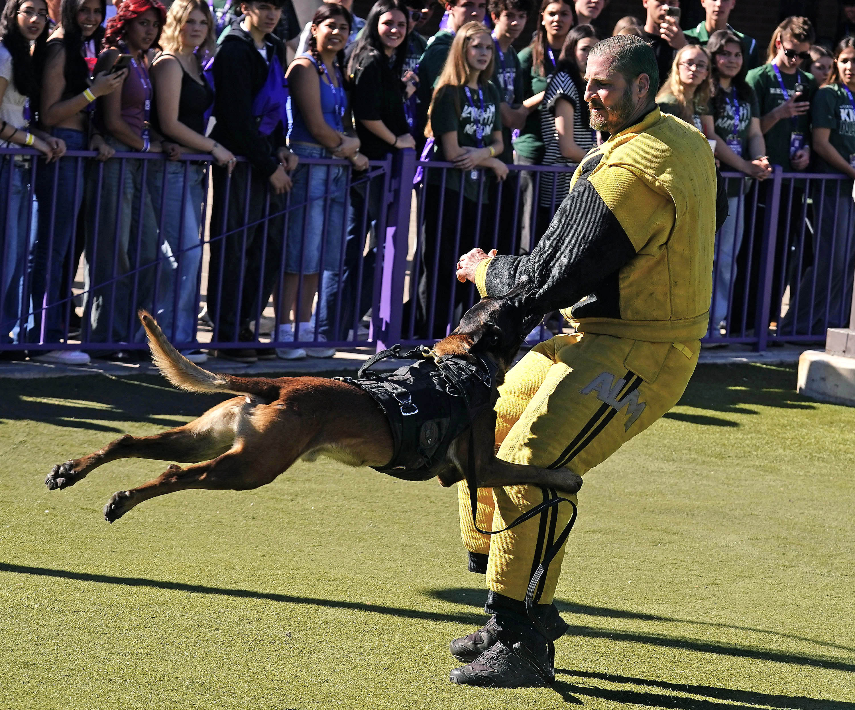 Urosh, a Phoenix Police Department K-9 Unit Belgian Malinois, latches on to the bite suit of Phoenix Police officer Brian Authement during a demonstration on the Quad as part of the College of Natural Sciences’ annual Forensic Science Day. Feb. 26, 2026. -
