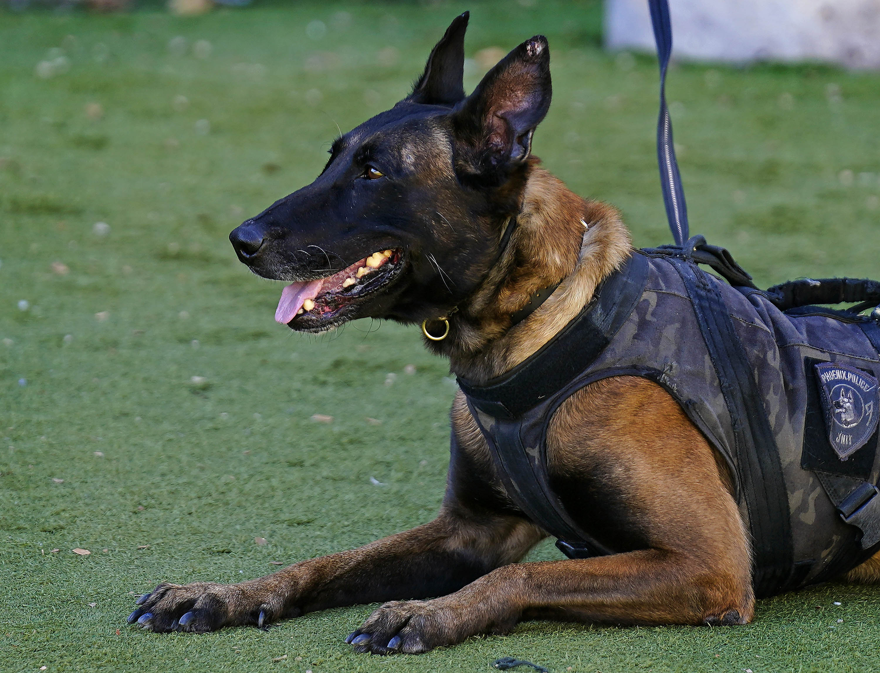 Urosh, a Phoenix Police Department K-9 Unit Belgian Malinois, focuses on his target during a demonstration on the Quad as part of the College of Natural Sciences’ annual Forensic Science Day. Feb. 26, 2026. -