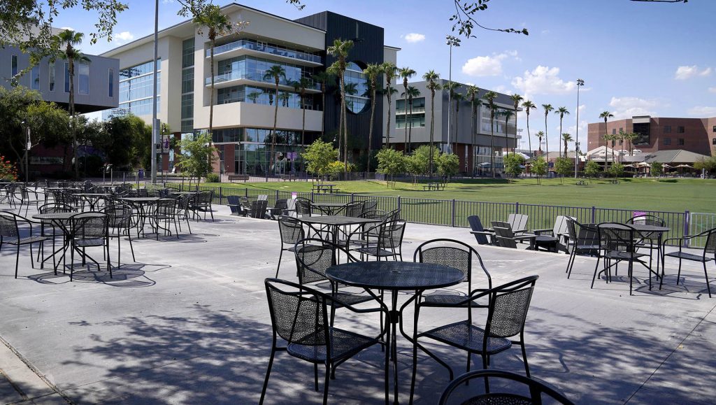 Prescott Field: GCU has created another signature, beautiful spot to gather right in the main thoroughfare of central campus. Prescott Field, once used mainly for lacrosse practice, has a new purpose: a fun space for many more to gather. Its turf lines have been painted, 20 lovely Indian rosewood trees were planted on the east and west sides for future hammock hanging and a paved patio on its south edge across from the Lope Shop is filled with tables and chairs.