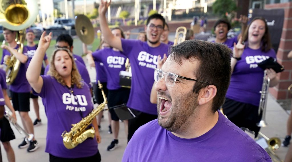 GCU Thundering Heard Pep Band member Connor Geroux, a junior film/production major, hypes it up like no tomorrow for the news crews, which also include ABC15 Arizona, FOX 10 and AZ Family.