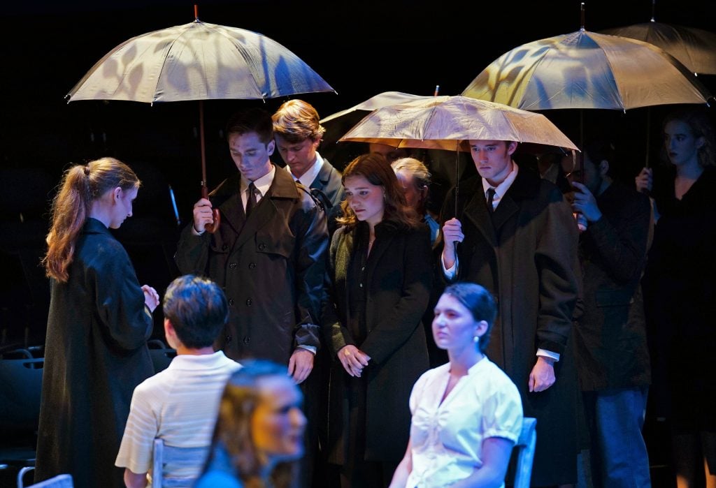 Part of the audience is seated onstage in a circle, while the rest is in the middle seating section of the house. Wooden chairs and tables are primary props, with a rare use of ladders as imaginary windows in two-story homes.