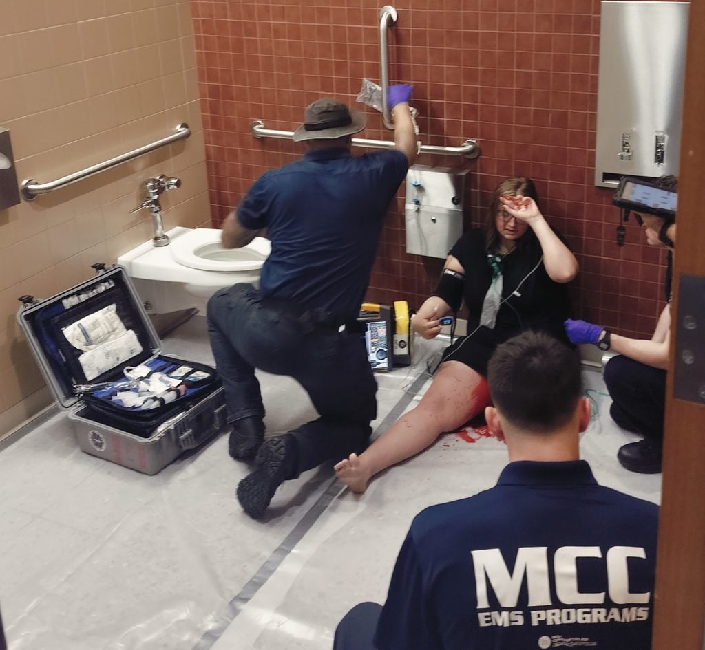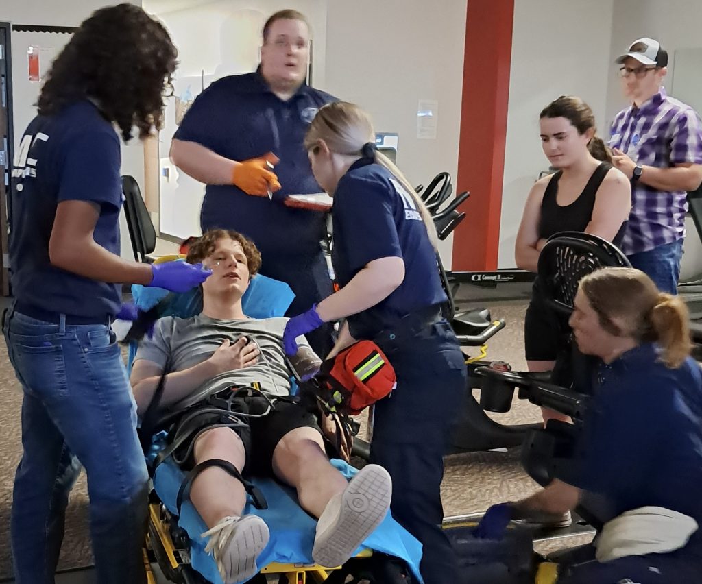 They took on roles as patients with pretend burns, shotgun wounds, schizophrenia and gastrointestinal bleeds to test EMT students’ medical knowledge, composure and skills as they approach the completion of the program.