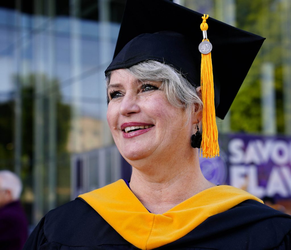She walked the stage at Grand Canyon University this morning in the first of six ceremonies over three days for online and cohort students at Global Credit Union Arena but not before giving a life summary (in her paraphrased words):