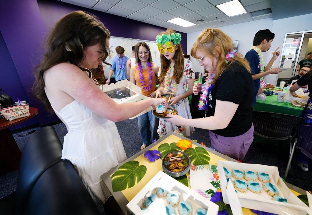 She was directing student workers and helpers to spread the green tablecloths for the luau, place the napkins and decorations she made, and reveal the table of cookies she baked, complete with little gummy fish swimming in blue icing.
