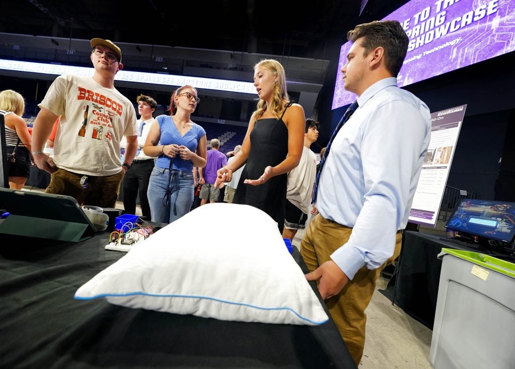 Inside the arena, mechanical engineering student Madeline Hammond and her team showcased their Vitals Pillow, a nondiagnostic wellness monitoring system that transmits physiological data for heart rate, respiratory rate, peripheral oxygen saturation (SpO2), temperature and blood pressure