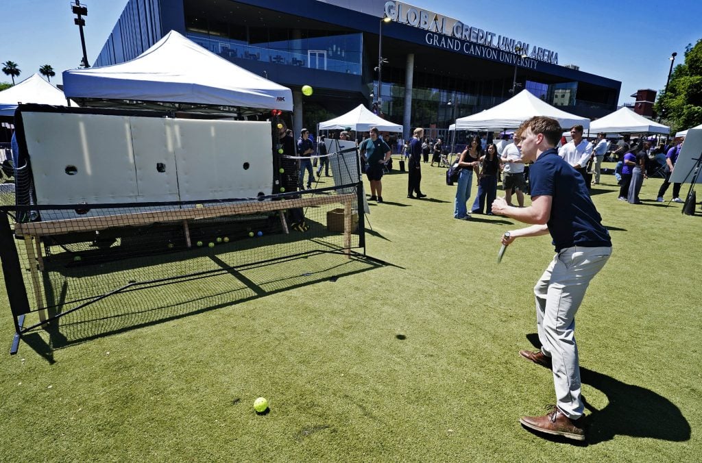 On the Quad, visitors smashed pickleballs out of the park – well, they smashed them against a pickleball paddleboard to test one engineering team’s capstone project, the PicklePod.