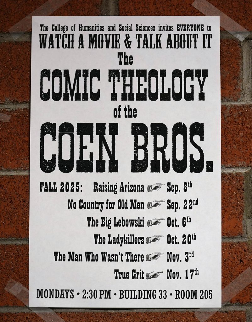 The what-have-yous is the wide range of films in six years of this free co-curricular offering, "Watch A Movie and Talk About It," ranging from those centered on AI subjects or movies about movies to this year’s series featuring the films of Joel and Ethan Coen. The subtitle: “The Comic Theology of the Coen Brothers.”