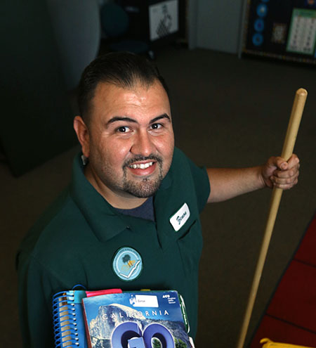 When his friend died during high school, Castro decided to pursue teaching as a career. He earned a bachelor’s in liberal arts from California State University, San Bernardino, in 2008, then became an elementary school teacher’s aide for four years before joining Mountain Vista as a custodian.
