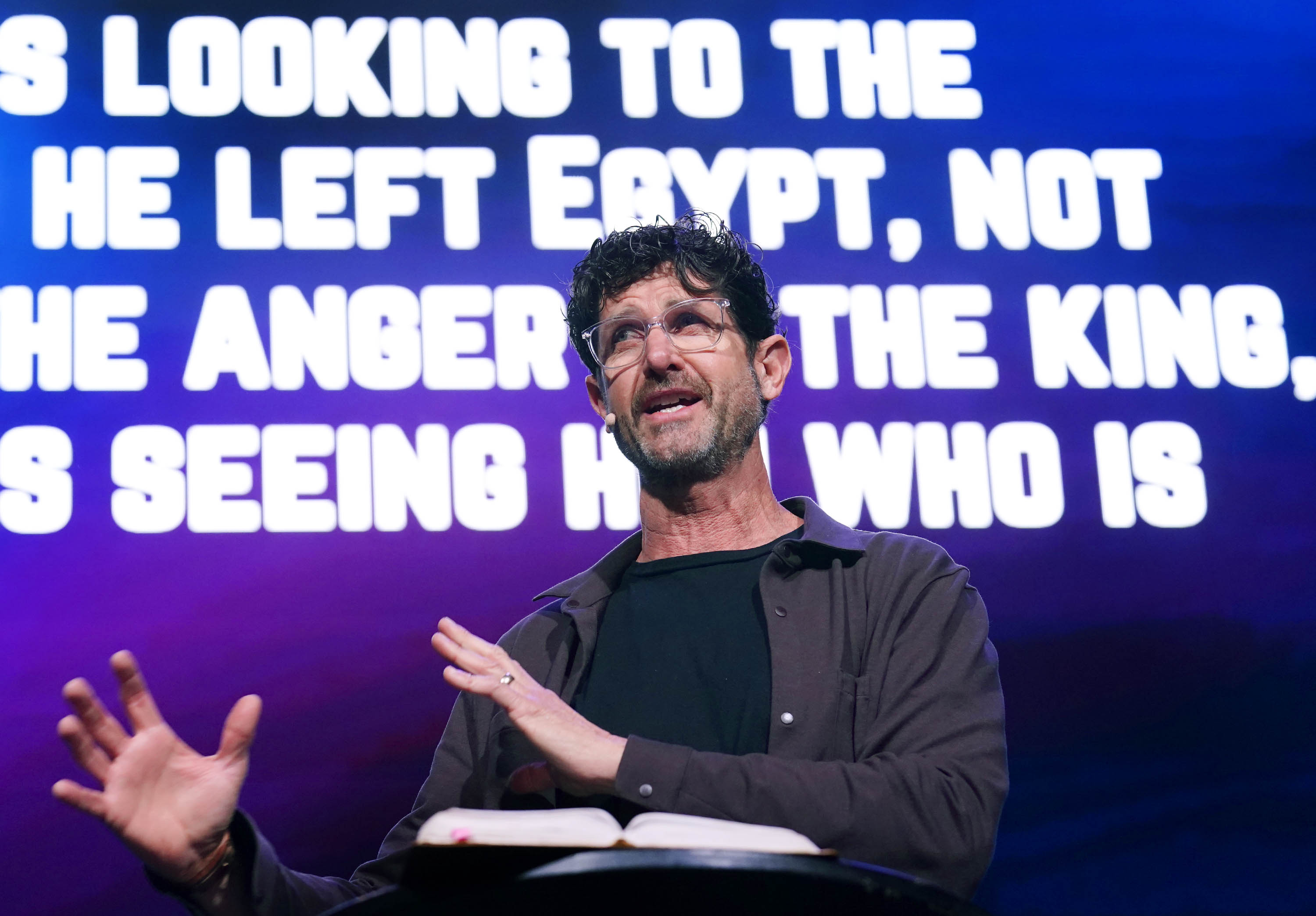 Illuminate Community Church pastor Jason Fritz discusses Moses' ability to overcome his insecurities through faith in God during Chapel on Monday, Jan. 26, 2026, at Global Credit Union Arena. -