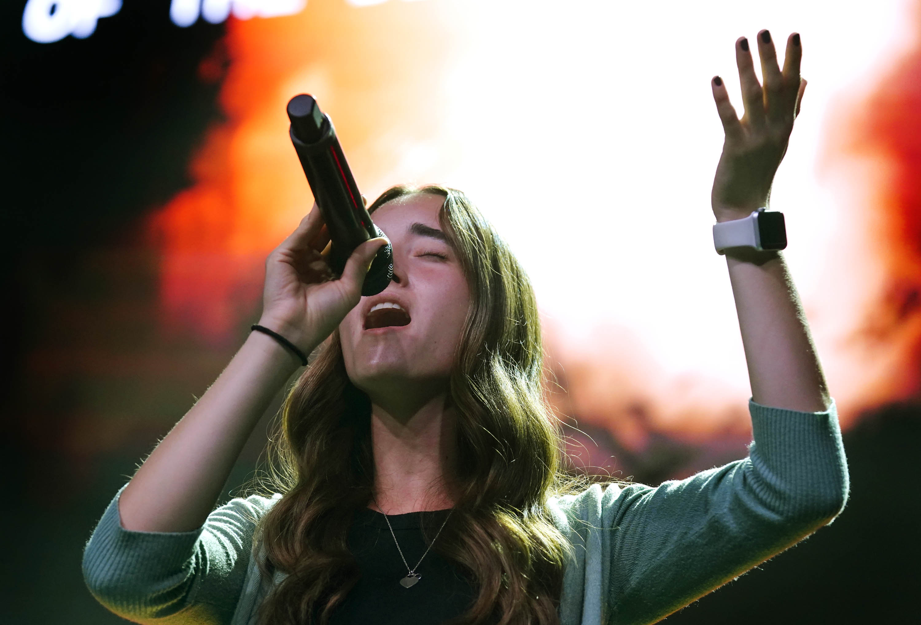 Hannah Eldridge and the Worship Team perform during Monday Chapel at Global Credit Union Arena. -