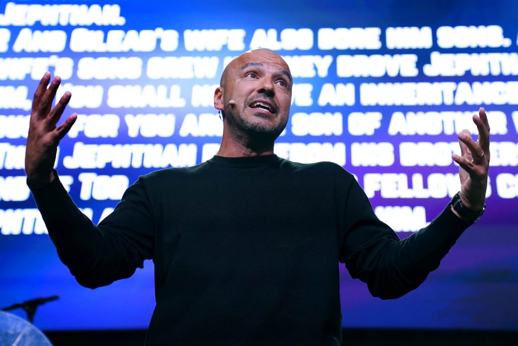 North Phoenix Baptist Church pastor Noe Garcia discusses Jephthah's ill-fated deal with God during Monday Chapel at Global Credit Union Arena. -