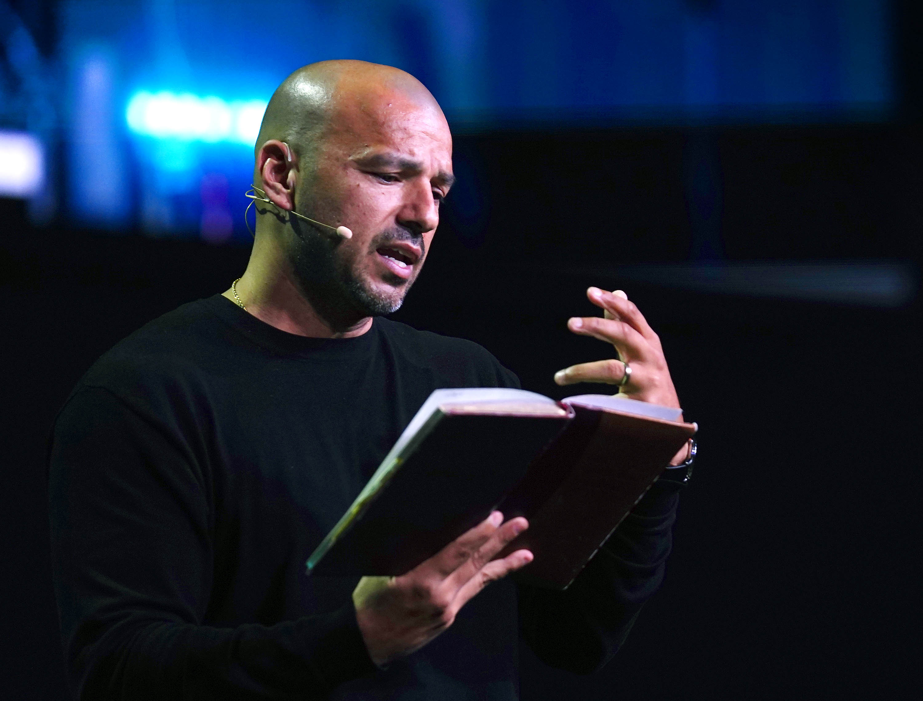 North Phoenix Baptist Church pastor Noe Garcia reads from his old journal during Monday Chapel at Global Credit Union Arena.