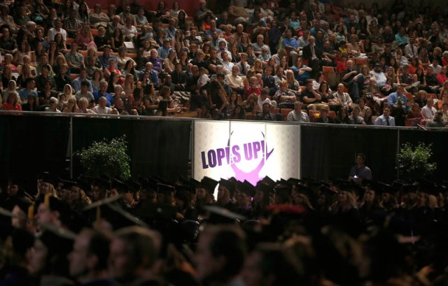 The spirit of the entire day unfolded in photos and commentary on the University's Facebook and Instagram pages. But visitors also had the option of texting messages to graduates via a program that displayed heartfelt or hilarious shout-outs on two Jumbotron-like screens flanking the main Coliseum stage.