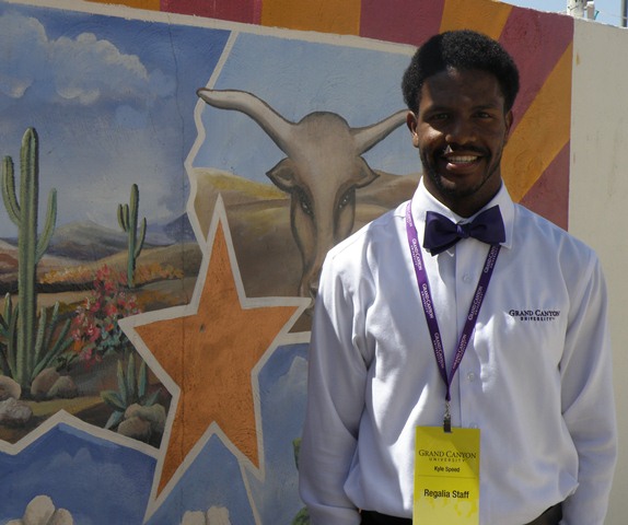 Speed, who looked dapper in a purple bow tie as he welcomed and directed grads during commencement, was a GCU fan favorite as a University advocate, family man, friend, believer and basketball star during his two-year tenure. The sports management grad left the University in 2012 to pursue a career in coaching. After a brief stint as a youth club coach in Kansas, he accepted a position as a GCU admissions representative in September.