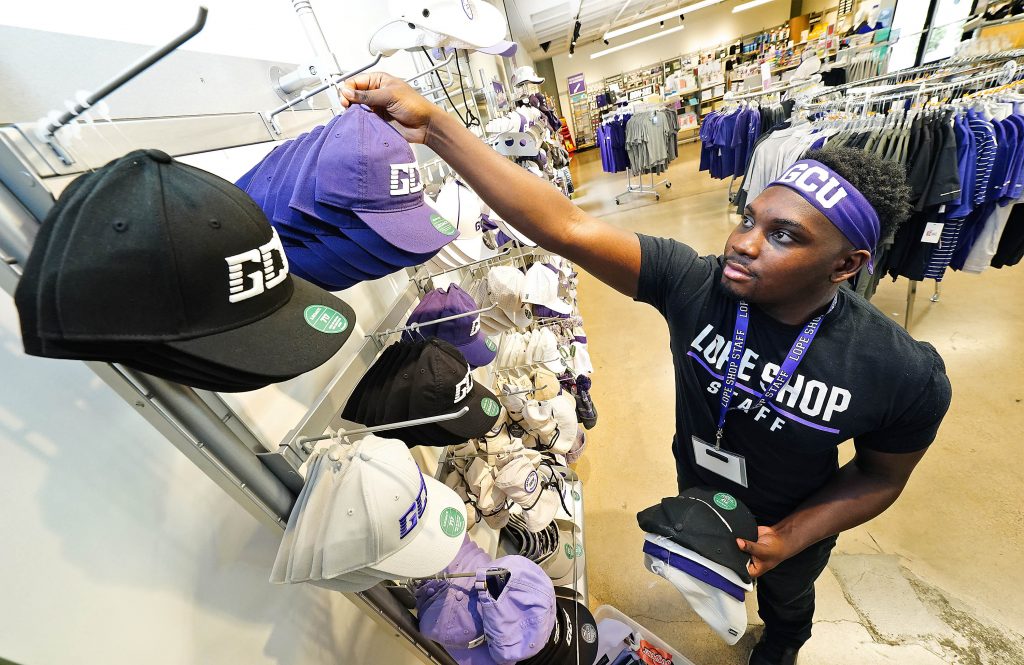 About an hour later, Bragelman pushed a bin full of neatly folded GCU apparel from the storage room to the store floor with assistance from Lowery, and Bragelman asked Miller about organizing size tags in drawers.