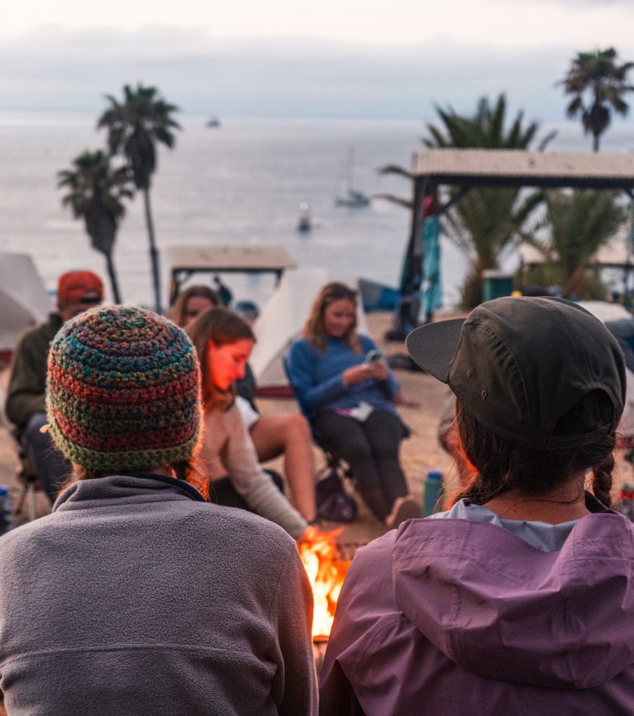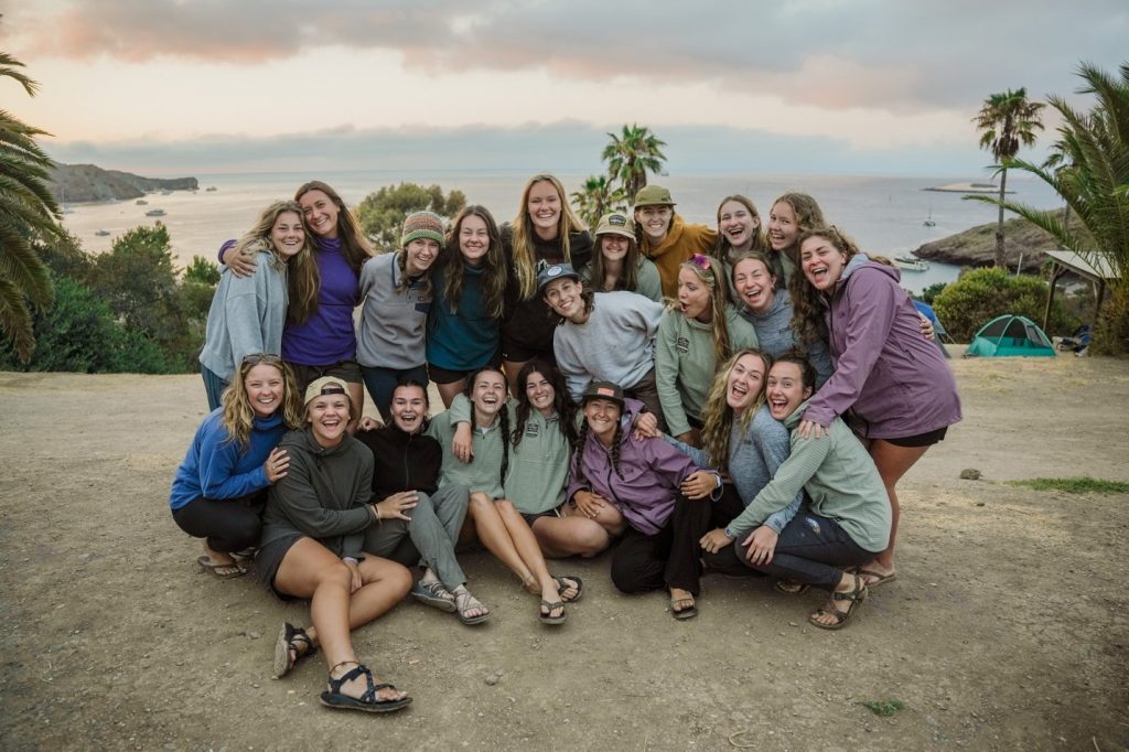 Overlooking a remote beach on Catalina Island, a group of girls rest in a circle after hiking 18 miles.