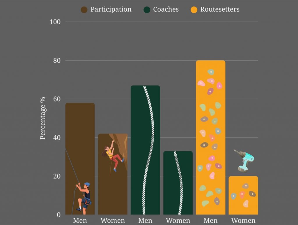 While about 42% of indoor climbers are women, Rock Spot estimates that only one-third of coaches and one-fifth of routesetters, who design and build climbing routes on indoor walls, are female.