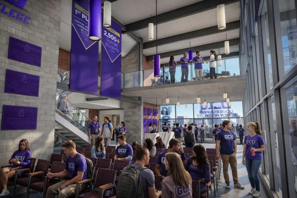 Now Grand Canyon University’s Ingram Honors College, recently named for land developer Mike Ingram and his wife, Sheila, is taking its place as the campus’s academic centerpiece. It will make its home in a showcase building at the entryway to campus that will be a hub for community and scholarly engagement when it opens next fall.