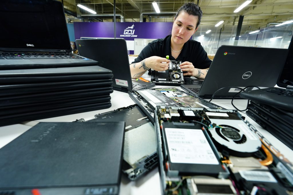 Student workers and volunteers from GCU, many who gain valuable skills as engineering or technology majors, help wipe the data, refurbish the computer and add necessary software.