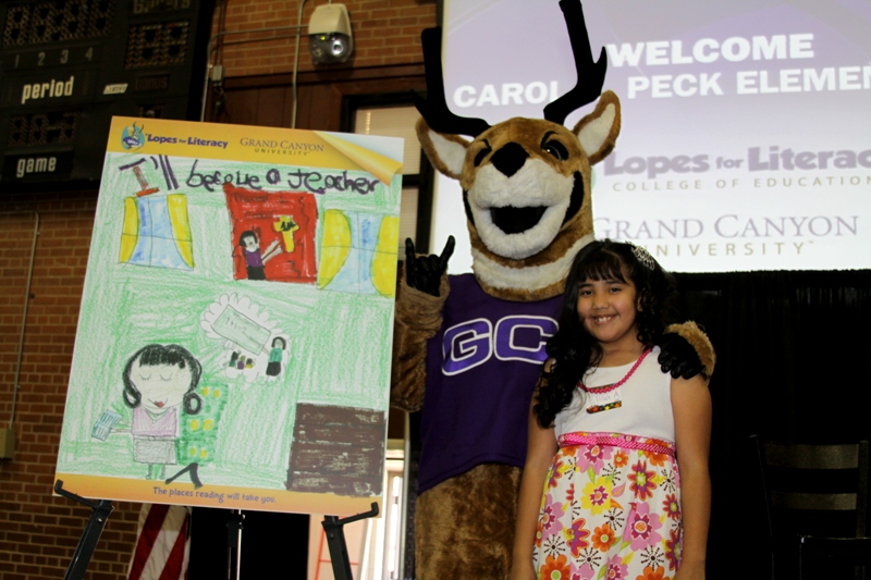 Elisa Castro, one of the third-graders, won a $1,000 scholarship to GCU in an artwork competition among three schools. Her selection earned all of Peck’s third-graders the trip to campus.
