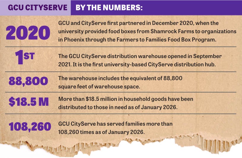 In the midst of the pandemic, GCU partnered with CityServe International – a network of churches that works to address their communities’ “last mile of need.” The university would create a distribution hub, GCU CityServe, that would be the organization’s first university-based distribution warehouse. It would serve the state of Arizona and would do so with the goal of being the hands and feet of Jesus.