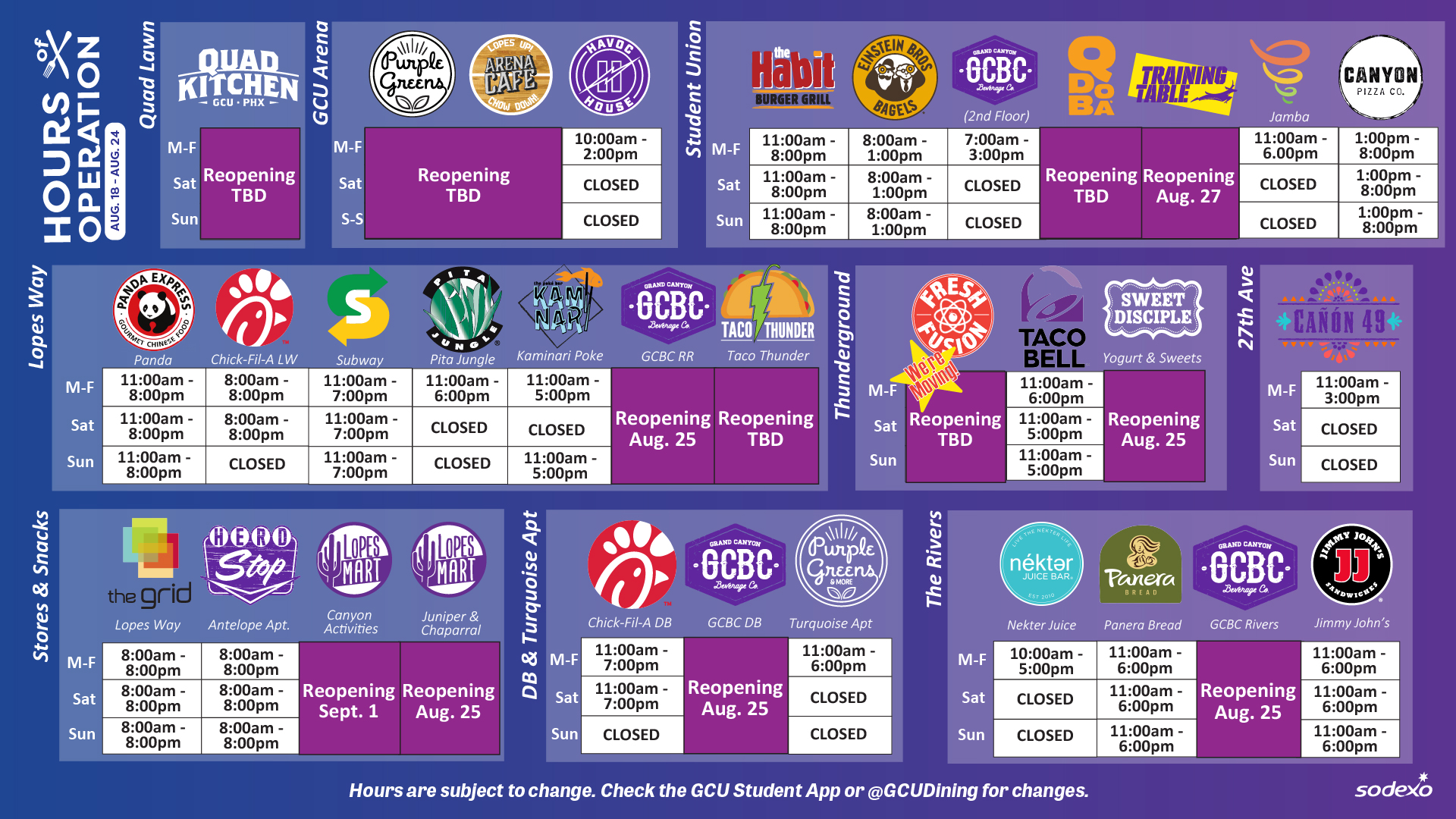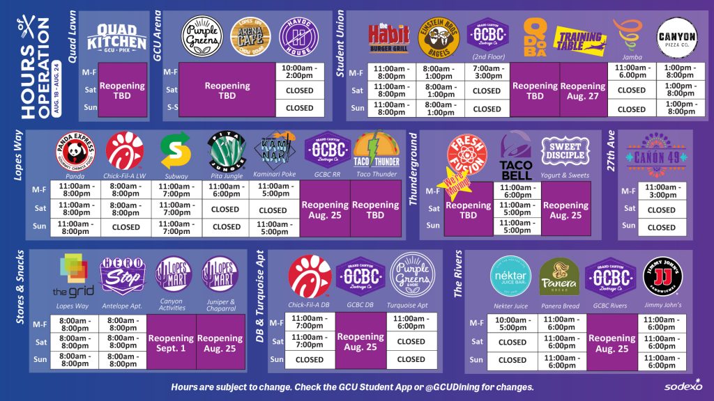 GCU Dining Hours of Operation, Aug. 18-24