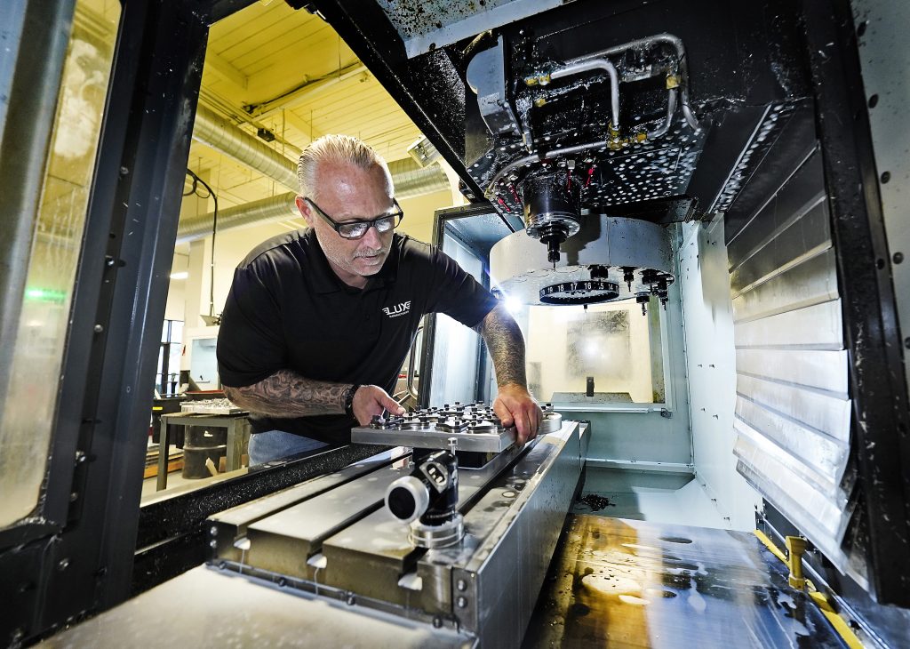 Lux is a fully functional, profit-making company, but it also helps educate future CNC machinists by partnering with the Center for Workforce Development to give part-time jobs to those in the CNC machinists undergraduate certificate program. It transitioned from a pathway to an undergraduate certificate program in the summer, making those students now eligible to apply for federal funding through the Free Application for Federal Student Aid.