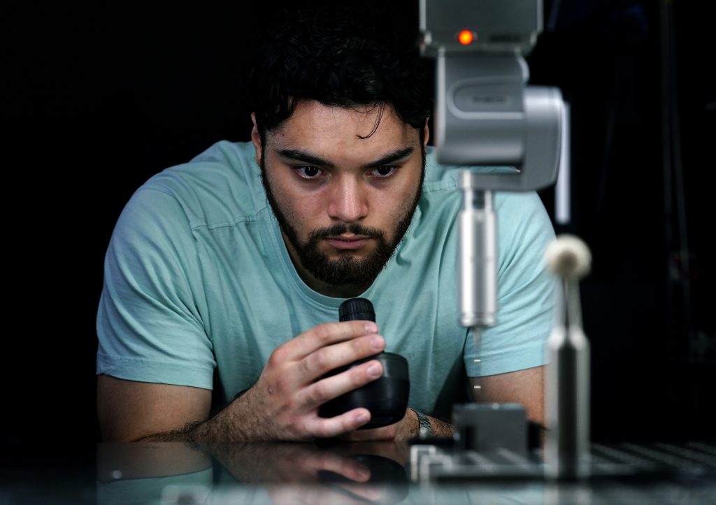 Manrique is regulating his breathing and movements as he peers into the machine while it collects precise data – to the micron (or submicron, if need be) – to determine lengths, widths, angles. The goal: to make sure a part produced at Lux, an on-campus aerospace machine shop that also makes parts for the medical and defense industries, meets design specifications.