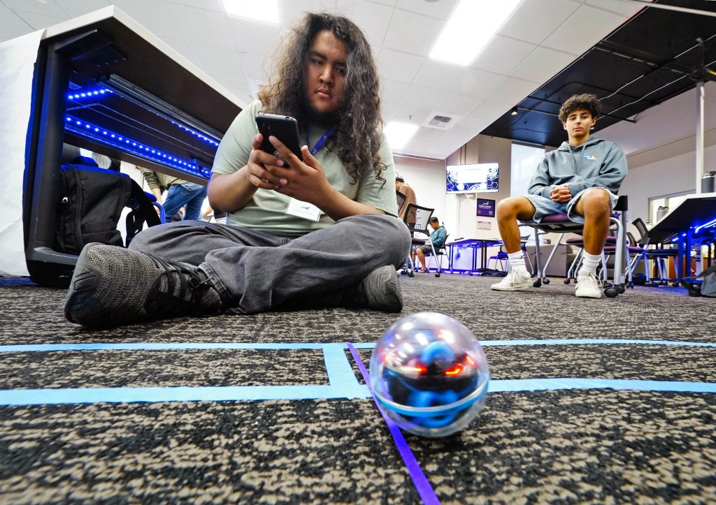High school students work at controlling a Sphero Bolt coding robot ball during the GenCyber Camp at the GCU Cyber Center of Excellence on June 12, 2025. -