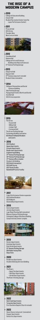 It’s a construction blitz that has culminated in 72 new structures and major renovations, including 30 of the campus’ 32 residence halls and apartment buildings, eight GCU-affiliated parking garages, five colleges, three administrative and support buildings, and about a dozen athletic, recreation and entertainment facilities. Those numbers don’t include the 32 on-campus dining options or various recreational fields or outdoor courts throughout campus.