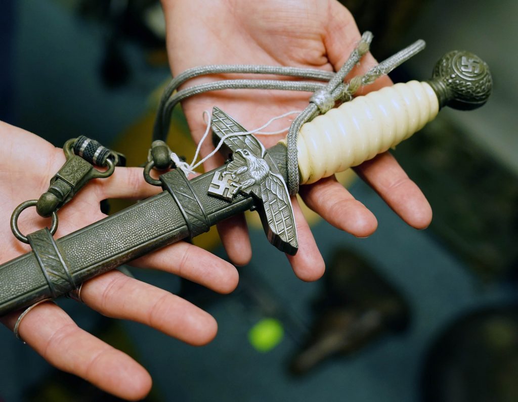 There is a large Nazi flag hanging from the ceiling, and Japan flags inscribed with the names of American soldiers who brought it home. And weapons, hundreds of weapons of war, that she had to learn.