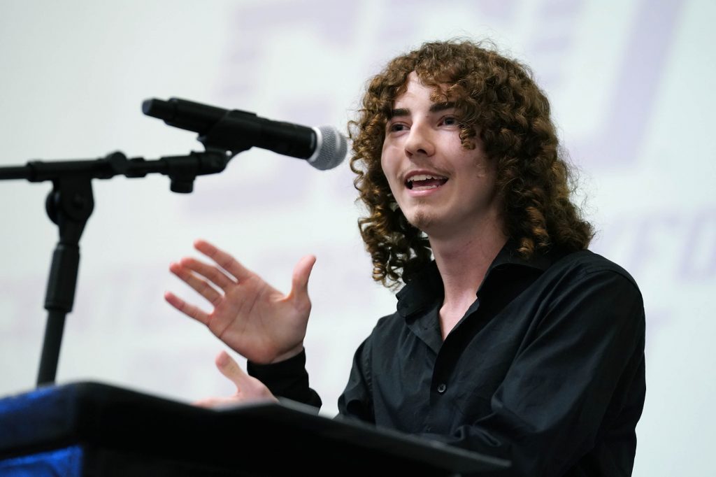 Riley Shoemaker, wearing dress pants and donning long curly hair, heartily spoke Thursday night in Sunset Auditorium with an ease beyond his 18 years. He had been a speaker at his Barry Goldwater High School graduation and had entertained scholarship offers from numerous colleges.