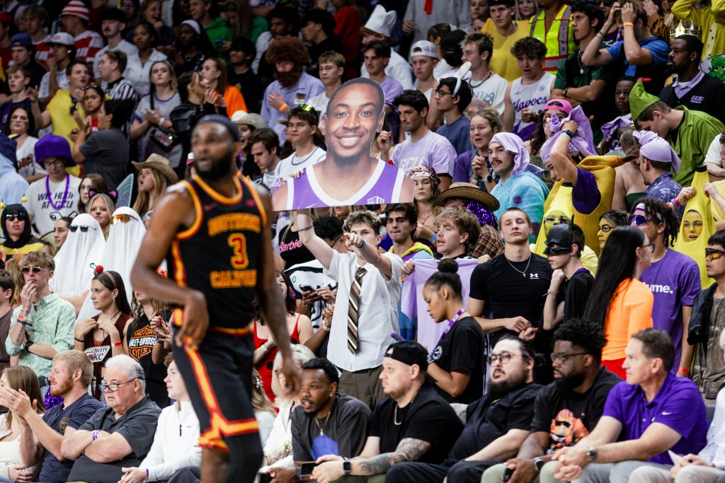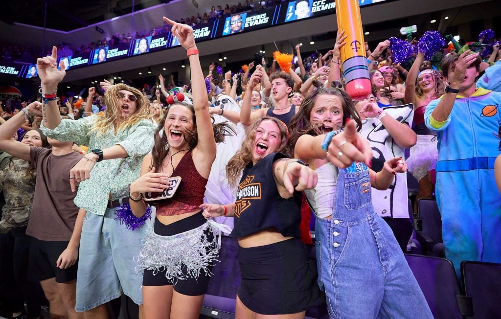 The team was greeted by a purple sea from the family section, but the constumed student section featured Santa Clause, Winnie the Pooh, Woody from "Toy Story," Nacho Libre, Teletubbies, Scooby-Doo’s Velma, Daphne and Fred, and more. Many held large cutouts of players or fun posters.