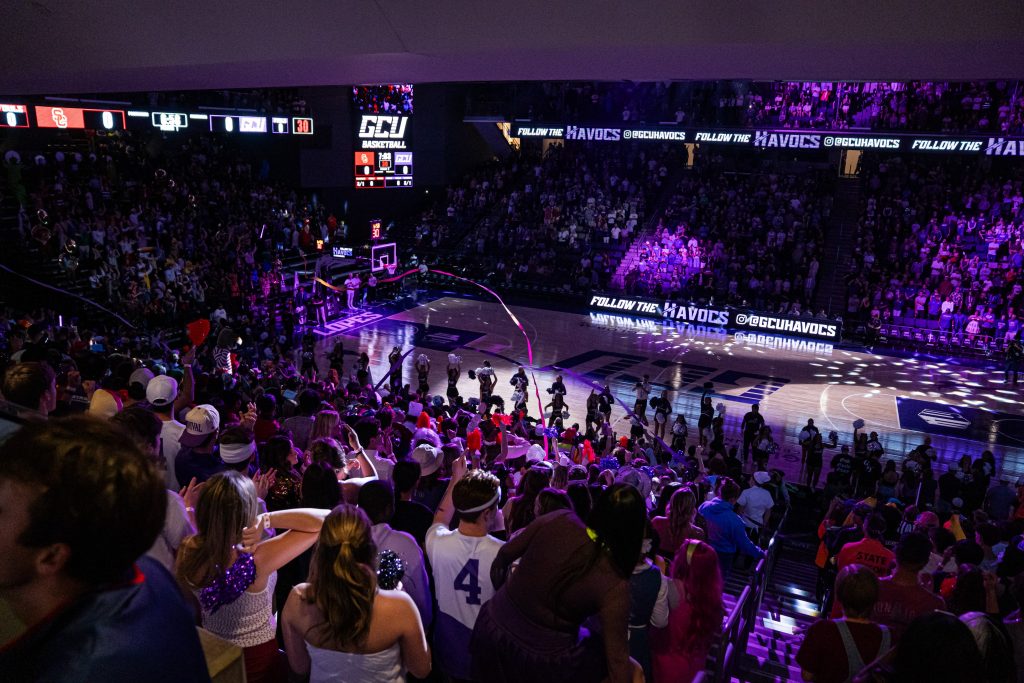 Fog machines and purple streamers exploded, the music beat dropped, and a group of cheerleaders ran out from tunnels each carrying a flag with a purple letter that together spelled, “GCU Lopes.”