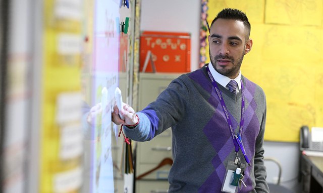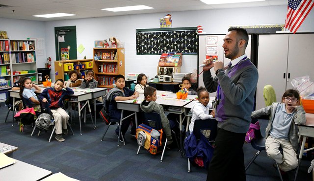 Like many elementary school teachers, Pérez is required to bounce between math and vocabulary lessons, following carefully crafted schedules to keep the class on track. His strategy stems from what he learned during his Rodel assignment. At one point, he shouted, “CLASS, CLASS!” and a cacophony of well-trained student voices replied, “YES, YES!” The brief din of antsy conversation was quieted.