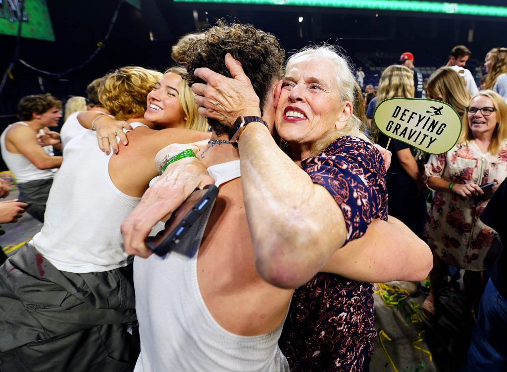 The Cheer team members who helped Deliverance slapped his back, his mom gave him a hug and grandma showed him her sign, “Defying Gravity.”