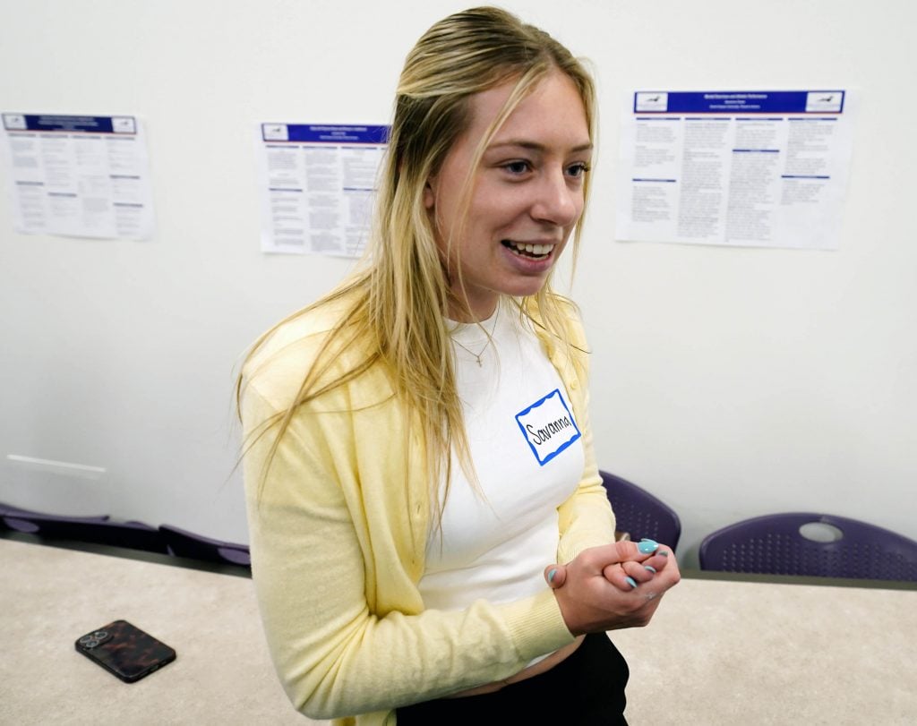 In one of the classrooms showcasing projects by psychology students, performance and sport psychology senior Savanna Chase presented her project on “Mental Exercises and Athletic Performance,” a study she designed, though didn’t conduct, for a professional counseling class.