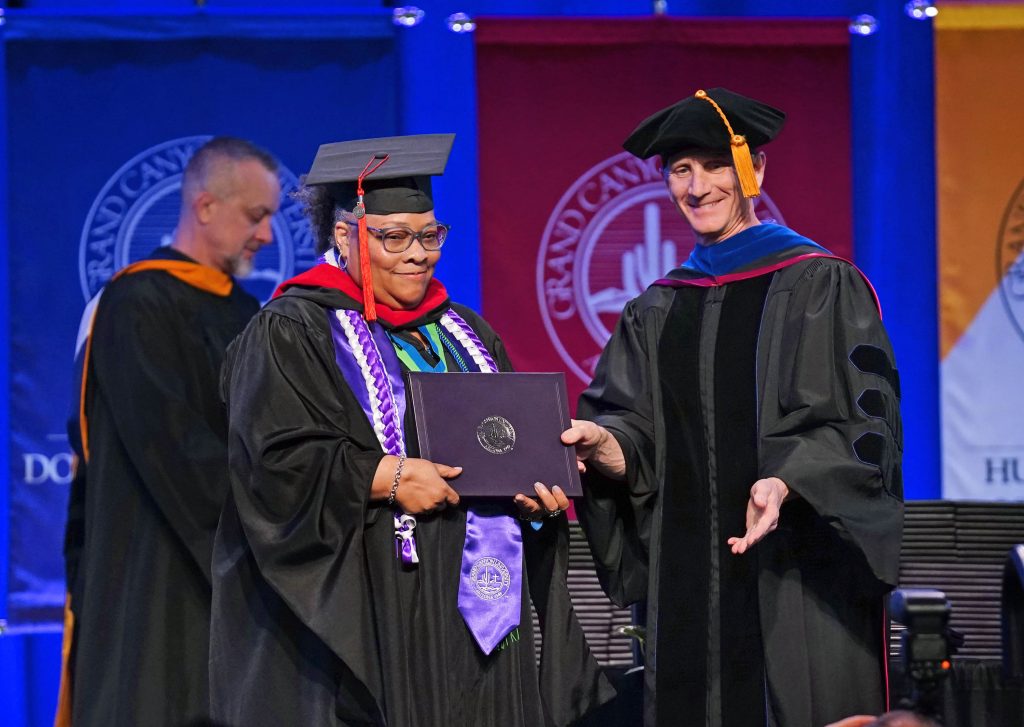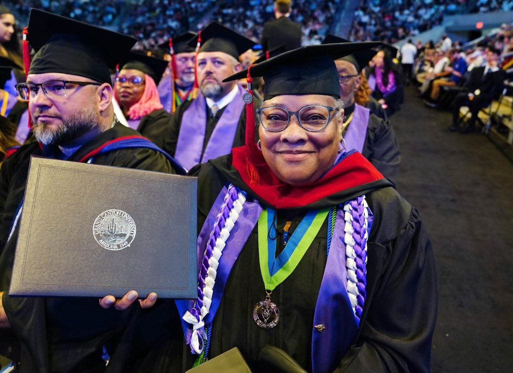 “When I first started this journey in 2016, it was in entrepreneurial studies,” said 68-year-old Leona Lowe as she was relaxing after walking for her master degree in Christian leadership, awarded April 29 at Grand Canyon University. “I was doing it to help my daughter open a dance studio – my husband and I were going to handle the business side – that’s why I started.