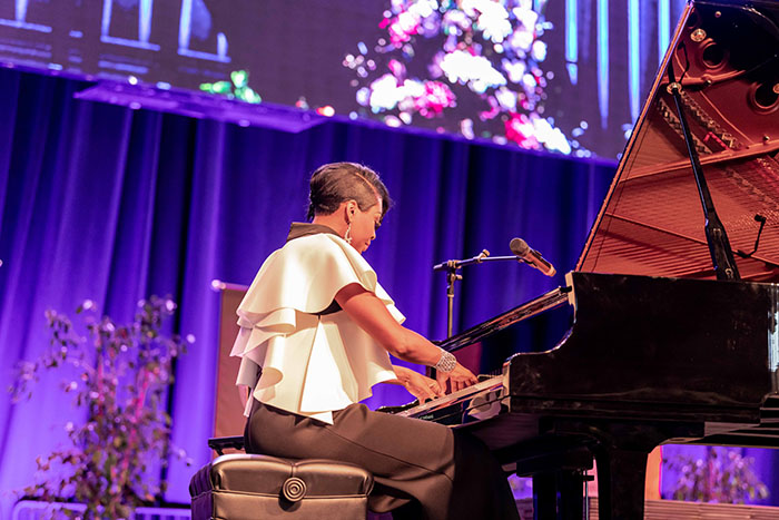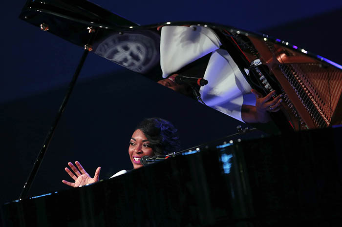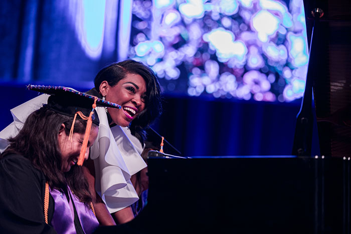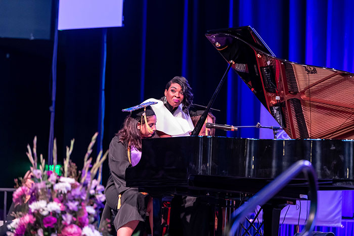 Jade Simmons delighted the crowd at Winter Commencement by inviting two students at each ceremony to play the piano with her. (Photo by Ralph Freso)