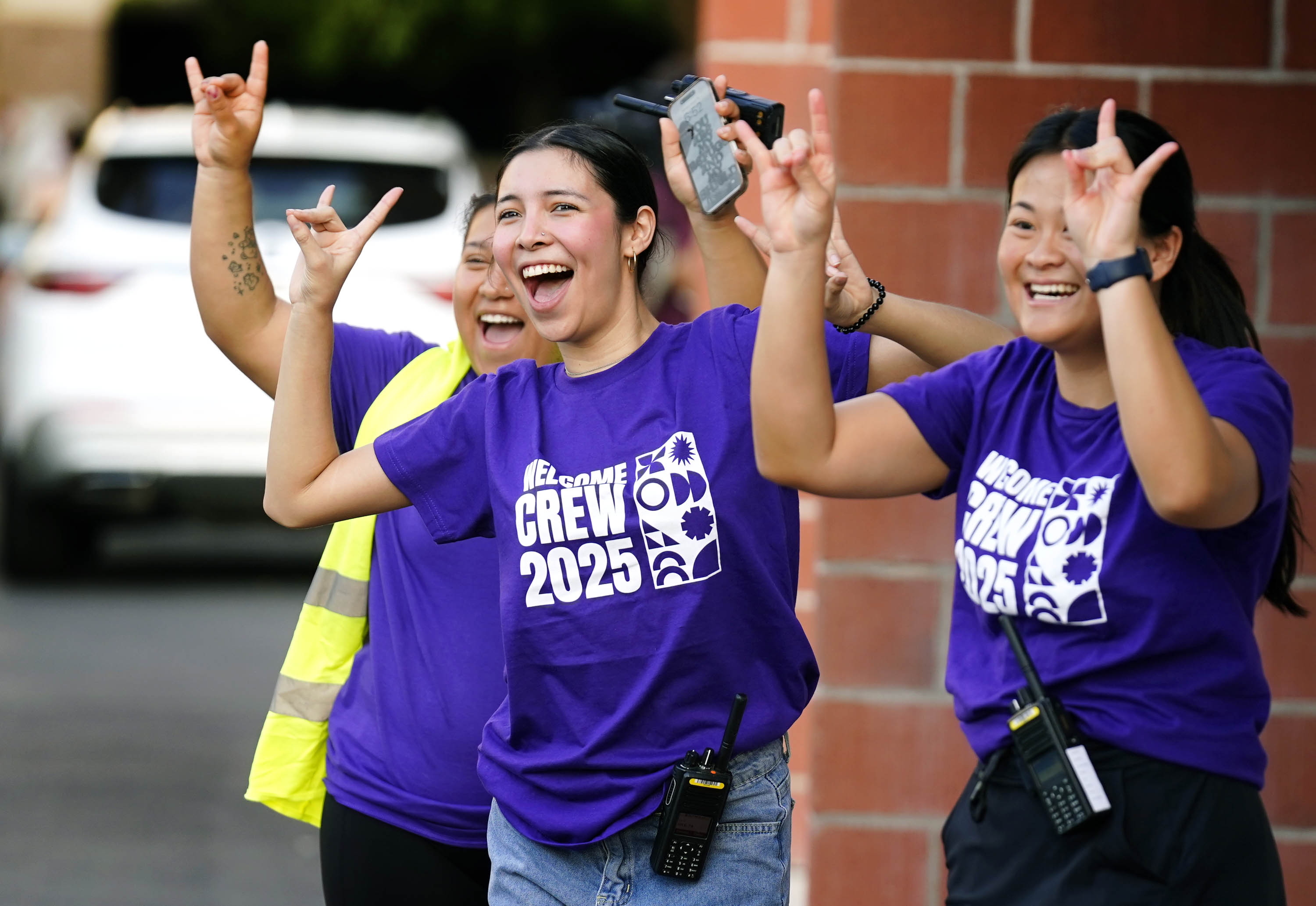 Welcome Crew members greet students and parents during Welcome Week’s Monday student move-in on Aug. 25, 2025. -