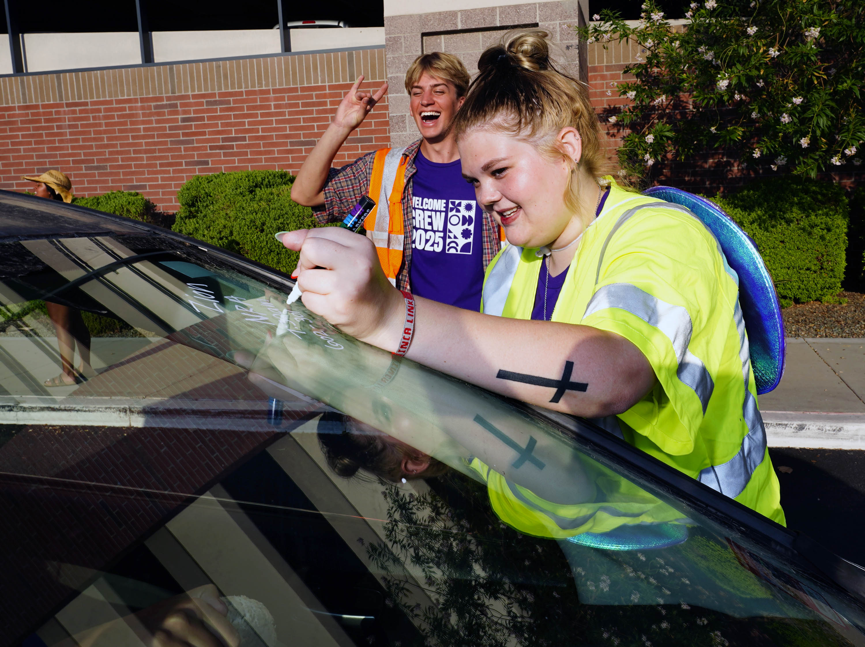 Welcome Crew member Hanna Miller writes building information on the windshield of incoming students during Welcome Week’s Monday student move-in on Aug. 25, 2025. -