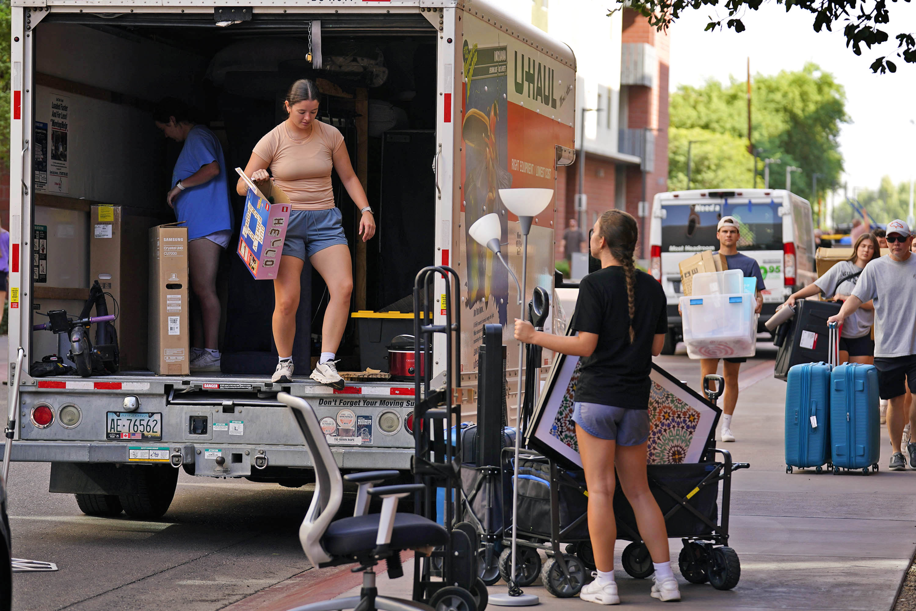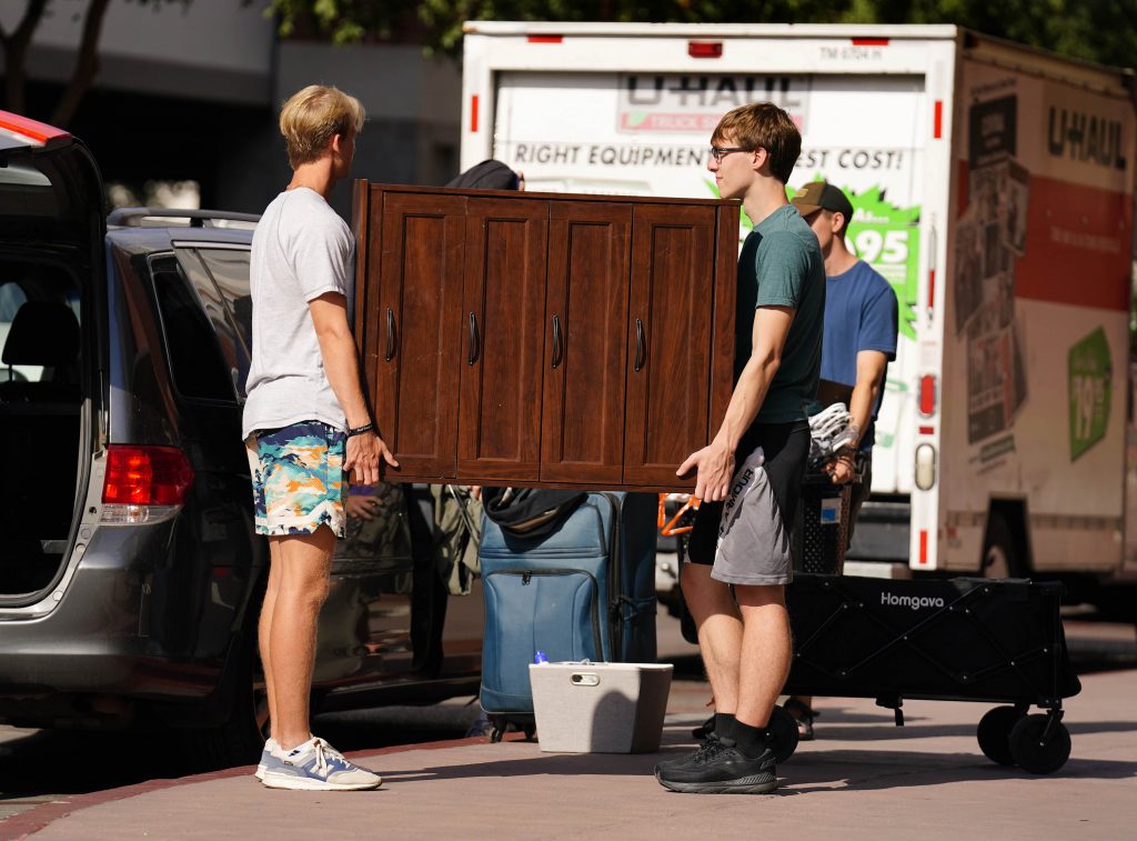 Students unload furniture near Jerome Apartments during Welcome Week’s Monday student move-in on Aug. 25, 2025. -