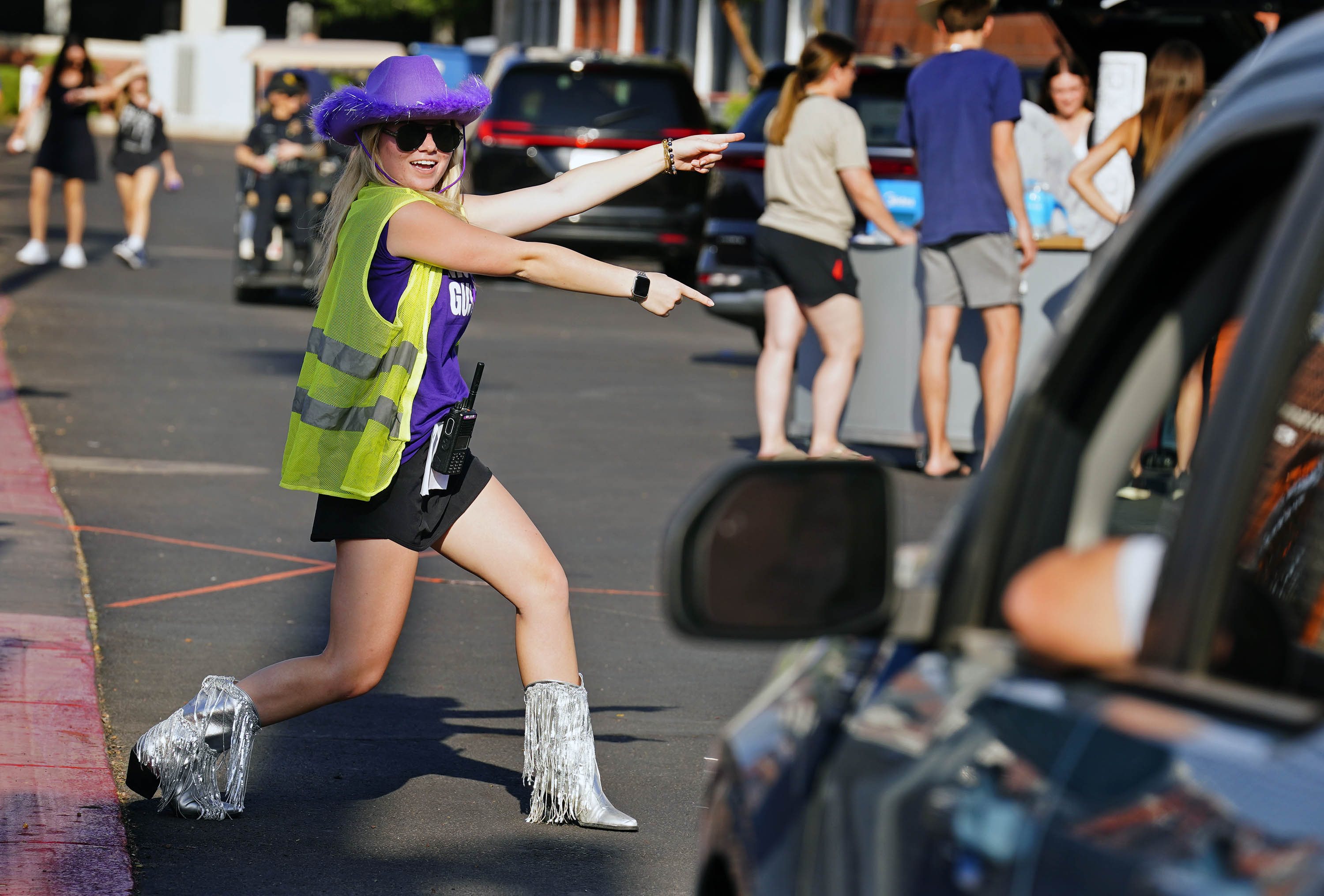 A Welcome Crew member directs traffic near Willow Hall during Welcome Week’s Monday student move-in on Aug. 25, 2025. -