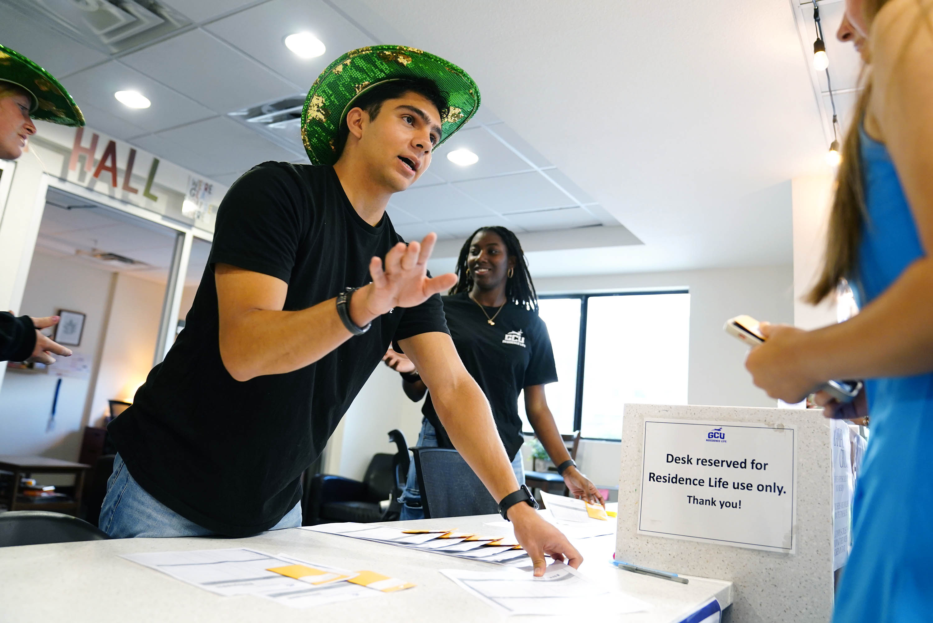 Junior resident assistant Adrian Realyvasquez assist students as they check in to Acacia Hall during Welcome Week’s Monday student move-in on Aug. 25, 2025. -