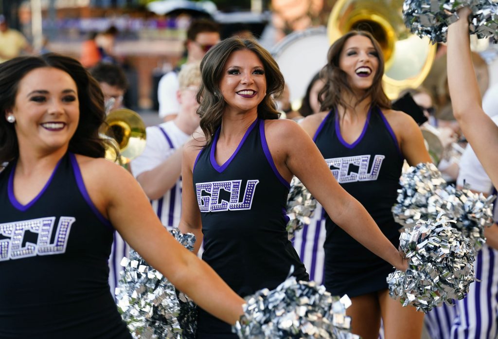 GCU dancers perform with the Thundering Herd Pep Band at the Grove during Welcome Week’s Monday student move-in on Aug. 25, 2025. -